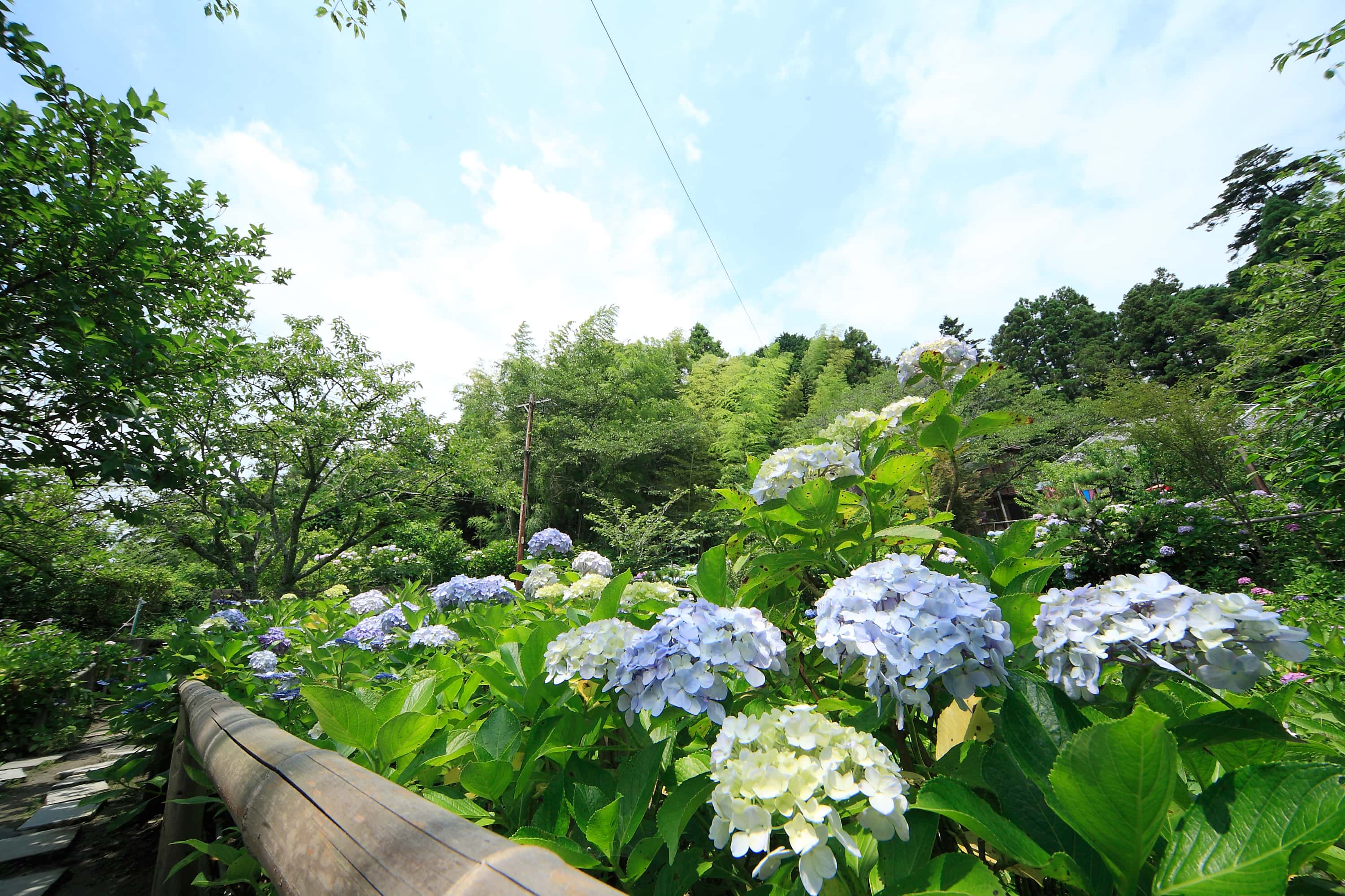 역에서 절 입구까지 이어지는 길과 절 경내 곳곳에는 다양한 색과 모양의 수국이 만개해 방문객들의 눈길을 사로잡습니다.