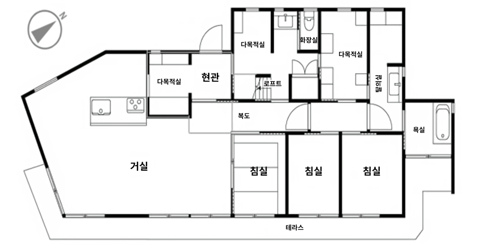마지막으로 층고가 높은 것을 확인하실 수 있는데, 지붕에 높이를 주는 설계를 통해 벽면적을 늘리고, 가능한 한 개구부가 많이 나 있어 자연광이 가져다주는 풍부한 온기와, 지역의 기후로부터 거주자가 자연 에너지를 적극적으로 확보할 수 있습니다.